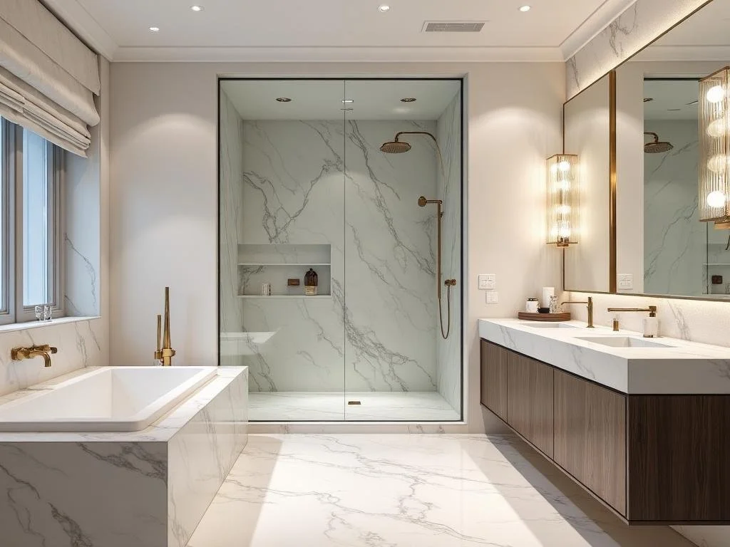 This luxurious, modern bathroom with a sleek design, features marble flooring and wall cladding, creating a clean and elegant look.